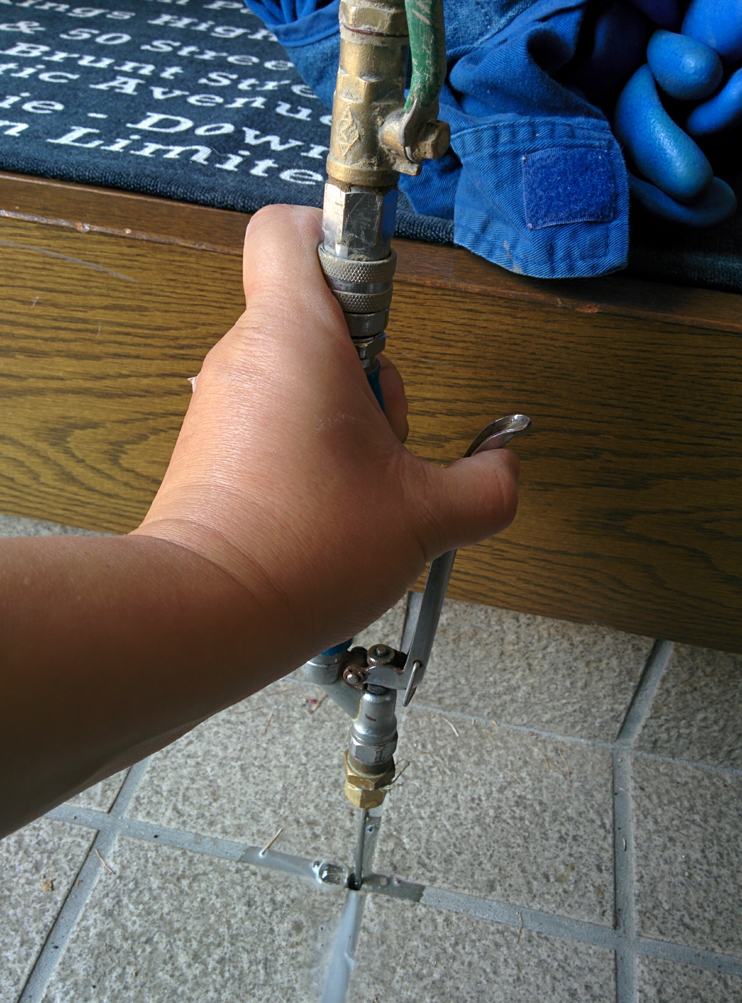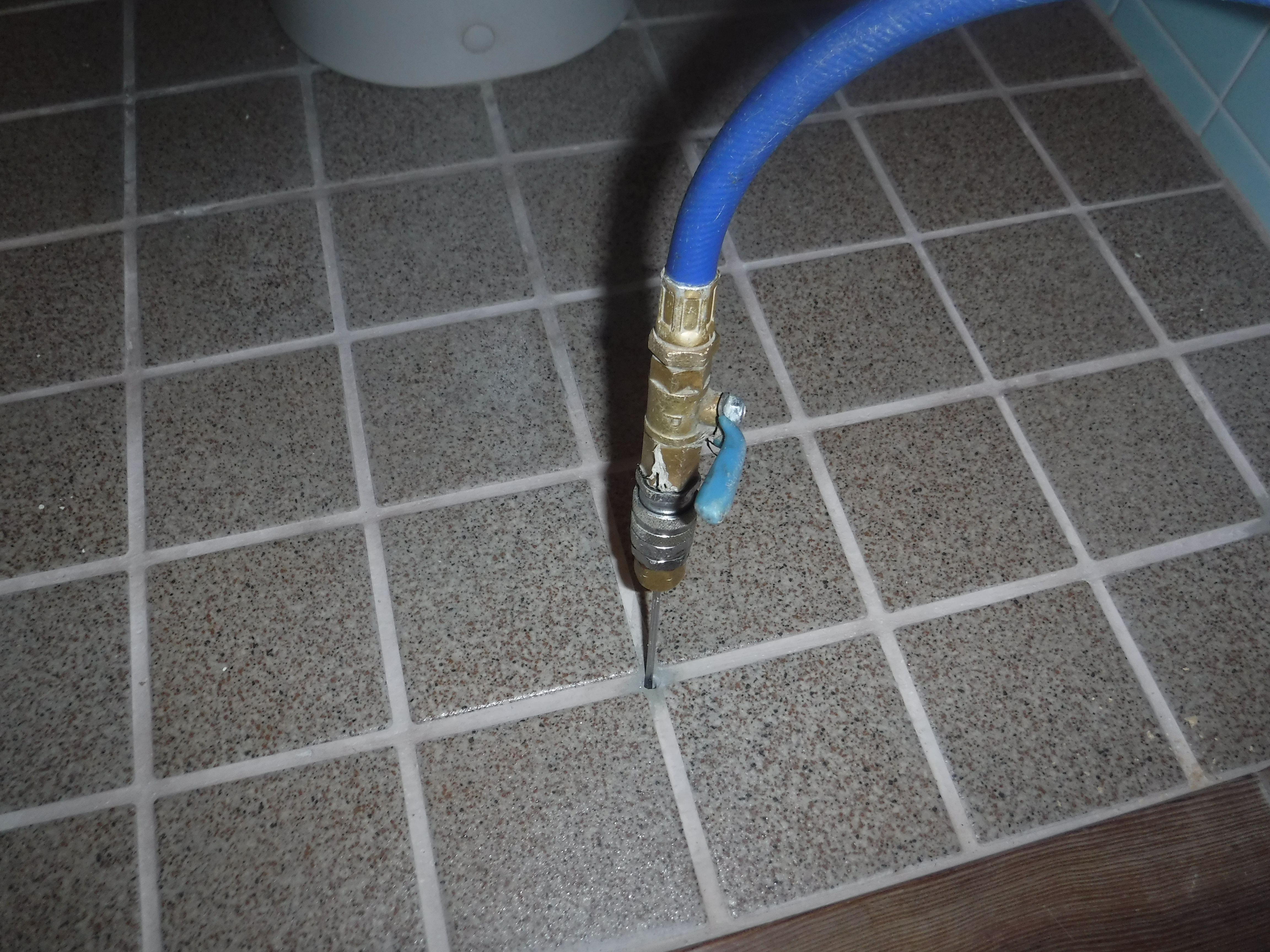 ⑥お風呂の土間を穿孔して薬剤を注入します